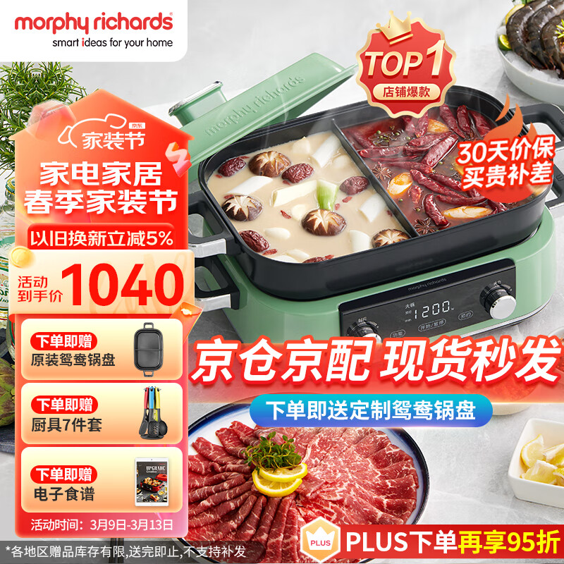摩飞电器(Morphyrichards)多功能锅 家用电火锅电蒸锅 5升可预约 大功率分体式蒸煮一体不沾煎烤料理锅 MR9099 薄荷绿价格:1040.00元!