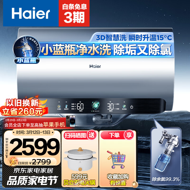 海尔(Haier)免清洗60升家用电热水器3300W大功率速热一级能效水质可视 EC6005-JE7KU1 净滤小蓝瓶价格:2799.00元!
