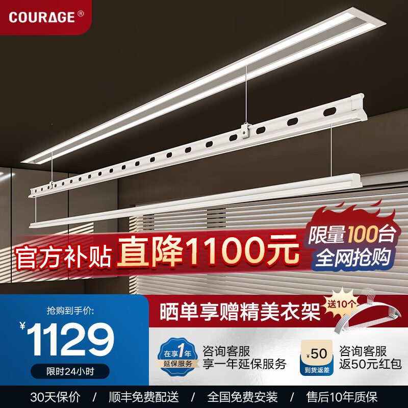 卡瑞琪(COURAGE)电动晾衣架隐形阳台家用隐藏式晾衣架升降薄晒衣架 米家2.7+被杆价格:2229.00元!