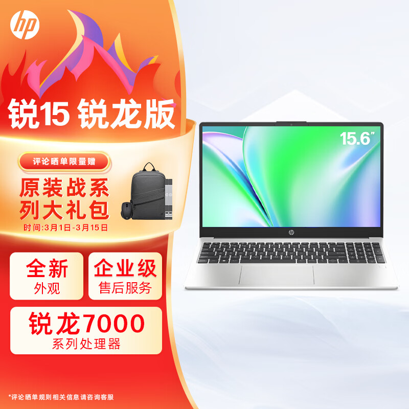 惠普(HP)锐15 AMD锐龙 15.6英寸轻薄笔记本电脑(八核R7-7730U 16G 512G 指纹识别 一年上门 13项军标认证)价格:3599.00元!