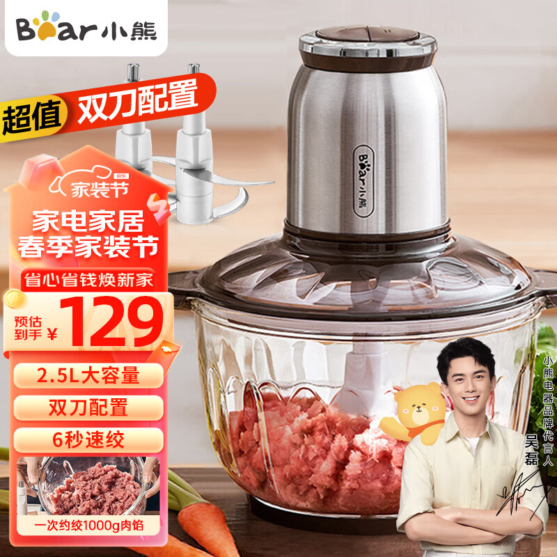 小熊(Bear)绞肉机家用 绞馅机 碎肉机 电动多功能料理搅拌打肉饺子肉馅蒜蓉机不锈钢 搅肉机QSJ-C04V3 2.5L价格:129.00元!