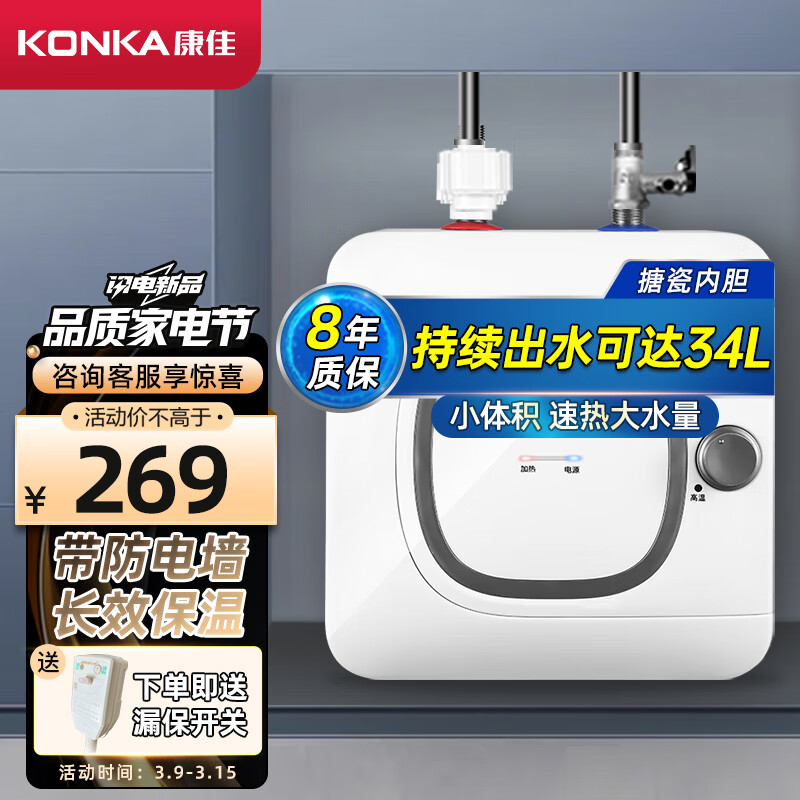 康佳(KONKA)小厨宝6升储水式电热水器 家用1500W速热 迷你小尺寸大水量 厨房台盆下安装DSZF-KW01(自行安装)价格:269.00元!