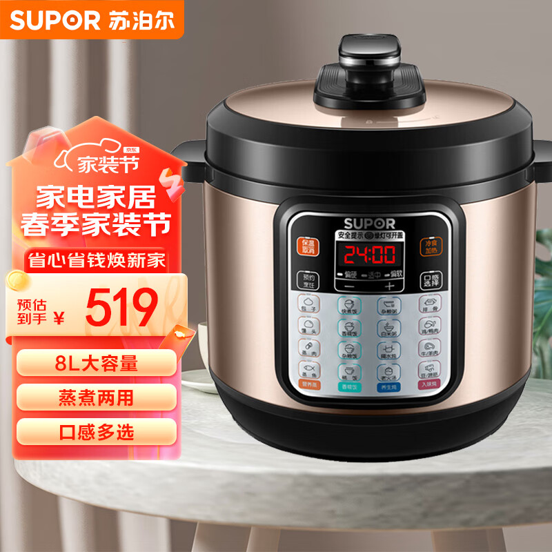 苏泊尔(SUPOR)智能电锅8L 大容量 多功能蒸煮炖焖高压饭煲 上蒸下煮一键排压 SY-80YC9510C 家用高压锅价格:569.00元!