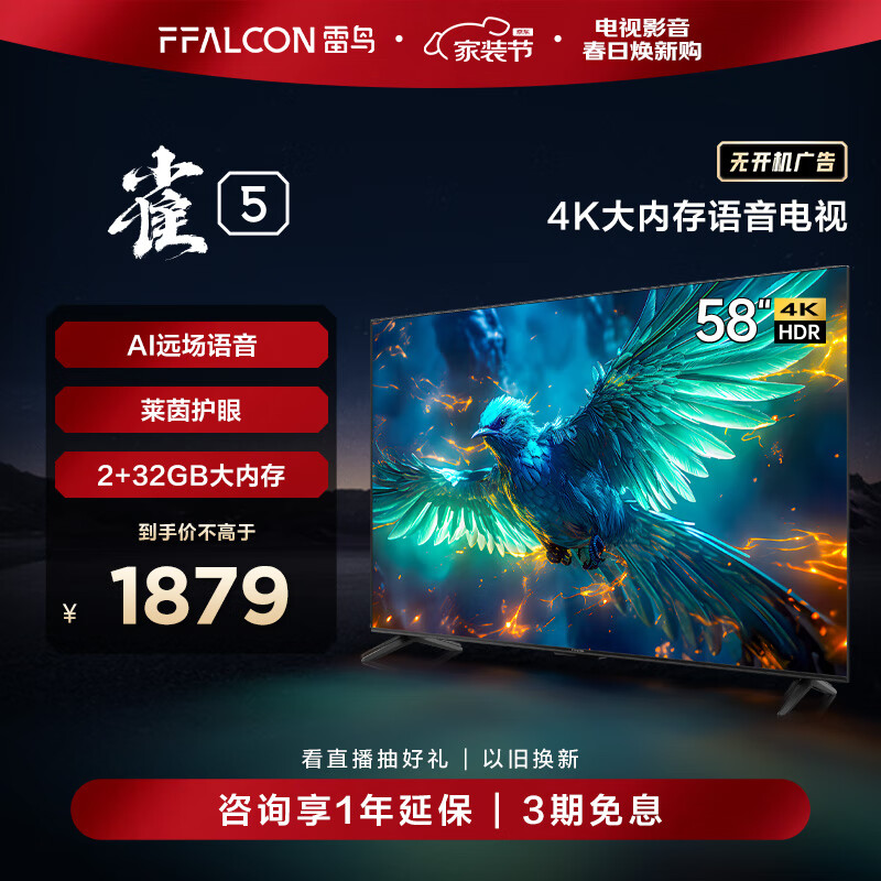 FFALCON雷鸟 雀5 58英寸电视 4K超高清 护眼防蓝光 超薄屏电视 2+32GB 游戏智能液晶电视机58F275C价格:1879.00元!