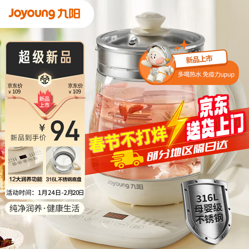 九阳(Joyoung)养生壶 1.5L煮茶壶煮茶器 玻璃花茶壶 316不锈钢烧水壶电热水壶 K15D-WY301价格:94.00元!