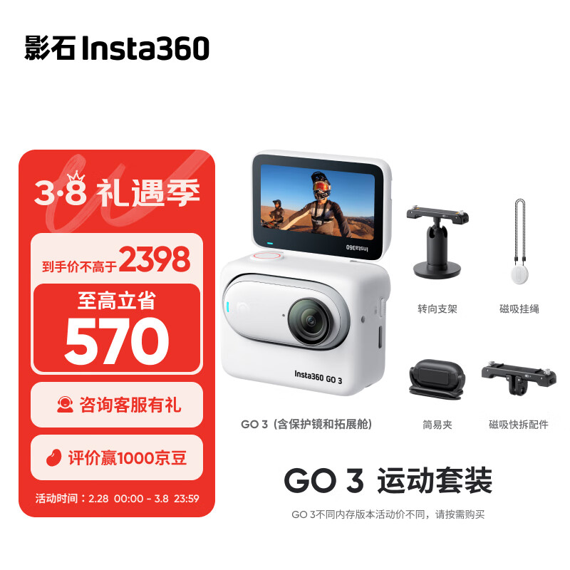 Insta360影石 GO 3拇指相机 运动亲子Vlog骑行宠物防水防抖运动相机(运动套装 灵动白128G版)价格:2398.00元!