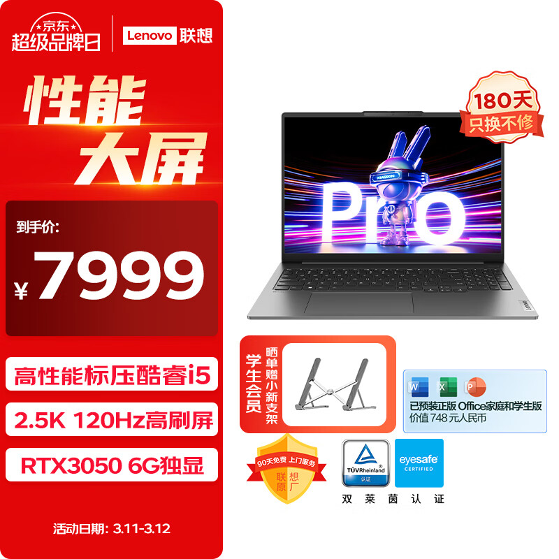 联想笔记本电脑小新Pro16超能本 高性能标压酷睿i5 16英寸轻薄本 16G 1T RTX3050 2.5K高刷屏 灰 游戏价格:7999.00元!