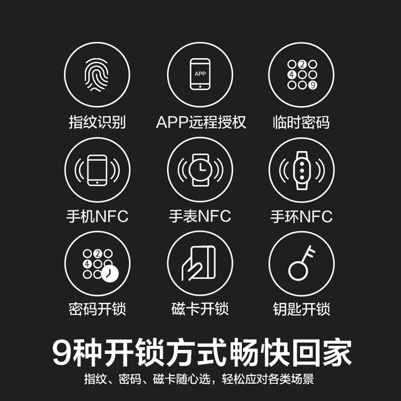 开锁方式:APP,NFC,临时密码,密码,刷卡,钥匙,半导体指纹