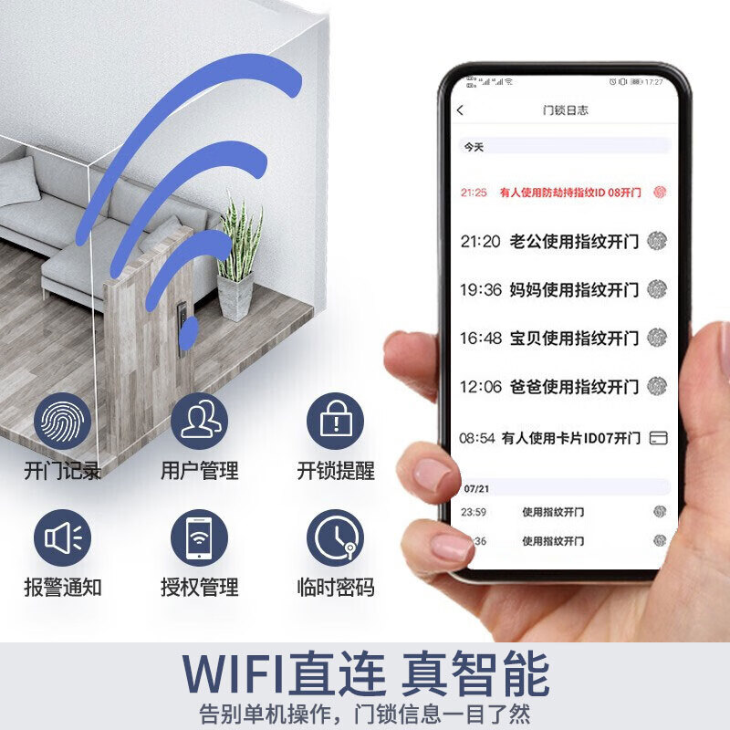 附加功能:静音模式,防试开报警,防撬报警,防劫持报警,防盗模式,电池更换提醒
