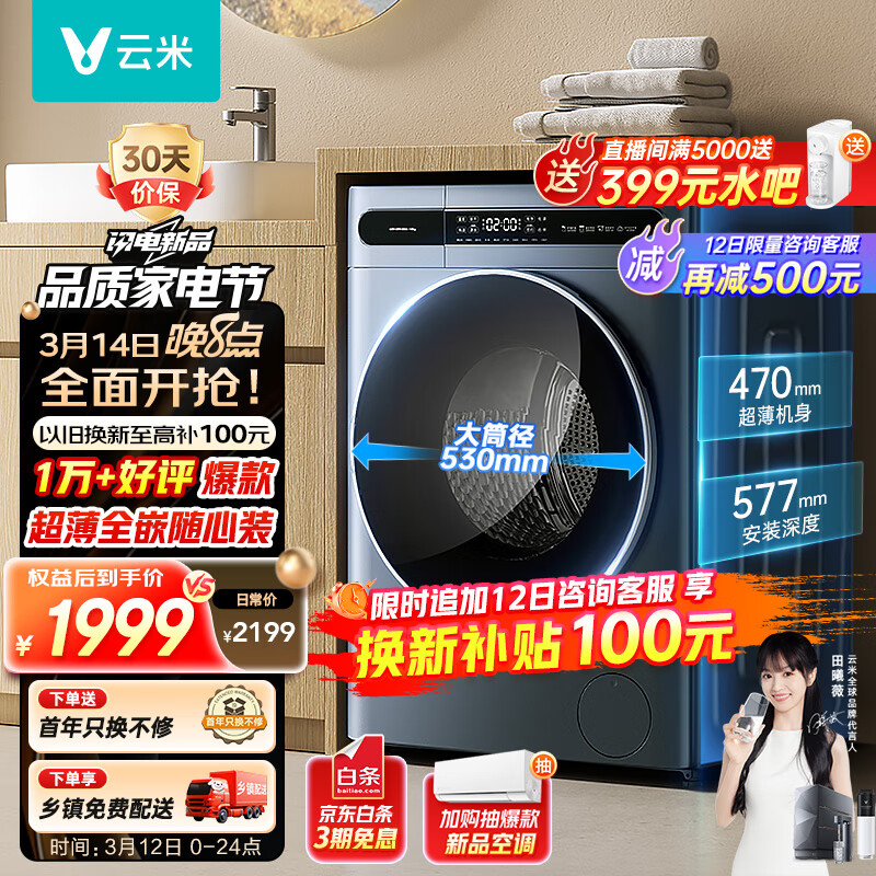 云米(VIOMI)滚筒洗衣机全自动 超薄全嵌 10公斤大容量 洗烘一体机Master1 空气洗除菌 大筒径 WD10FE-B6A价格:2099.00元!