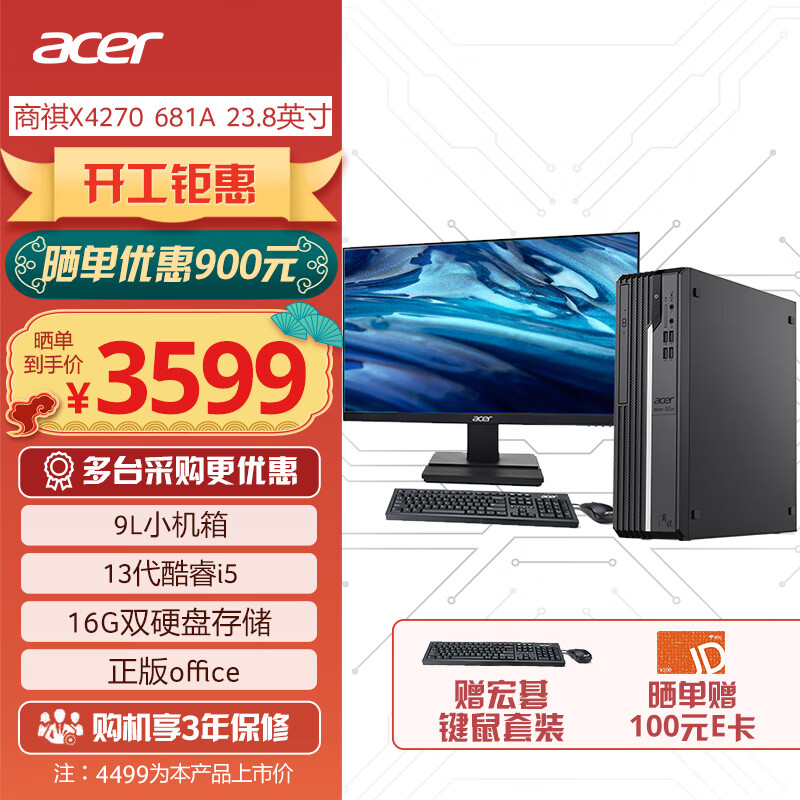 宏碁(acer)商祺X4270 681A 23款商用办公电脑台式主机 (酷睿13代i5-13400 16G 256G+1T) 23.8英寸显示器套机价格:3699.00元!