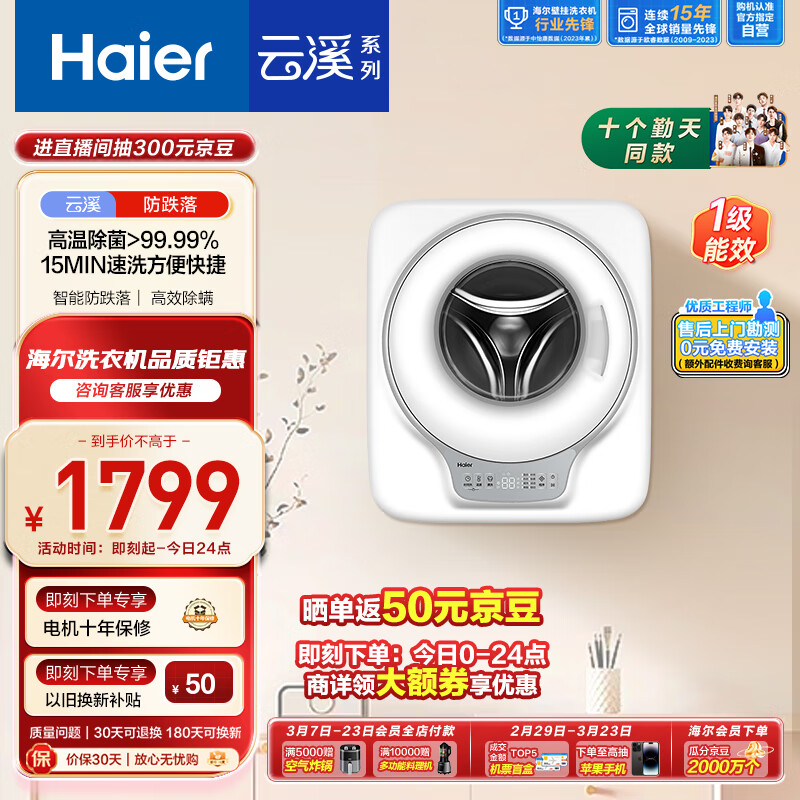 海尔(Haier)云溪系列 壁挂洗衣机 防跌落 滚筒 小型 内衣裤洗衣机 婴儿 儿童洗衣机 3公斤 高温除菌EGM30707价格:1899.00元!