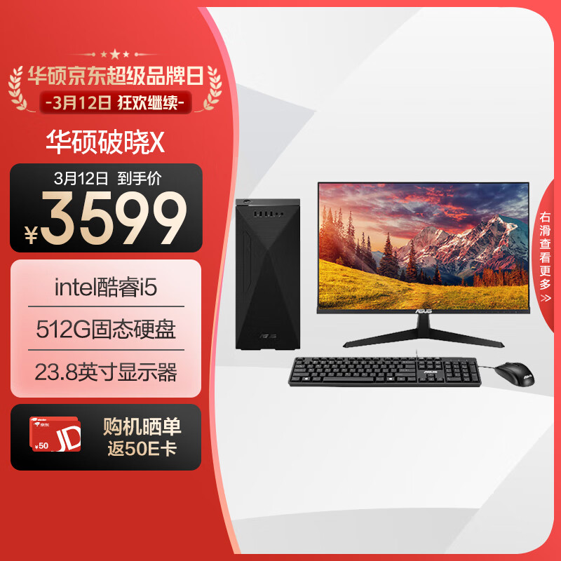 华硕破晓X 个人办公家用商用台式机电脑整机(12代intel i5-12400 16G 512GSSD 大机箱)23.8英寸显示器价格:3599.00元!