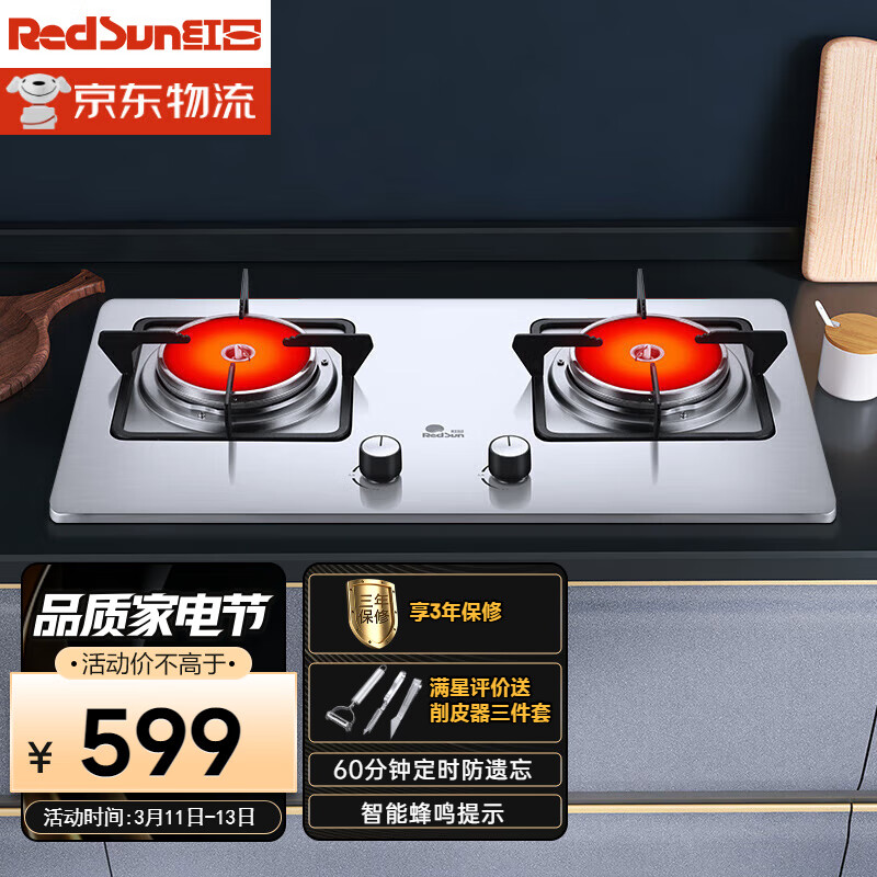 红日(RedSun)红外线灶嵌入式双灶家用不锈钢面板节能猛火灶快速点火 JZY-EM208G(液化气)价格:599.00元!