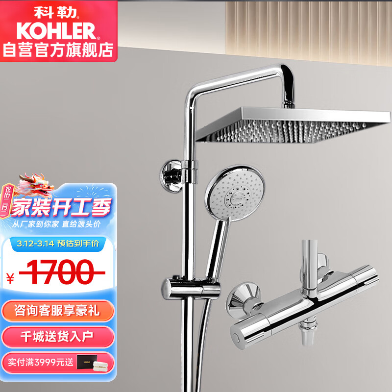 科勒(KOHLER)淋浴花洒套装 齐乐恒温双花洒多功能淋浴柱 26469T-9-CP价格:2124.00元!