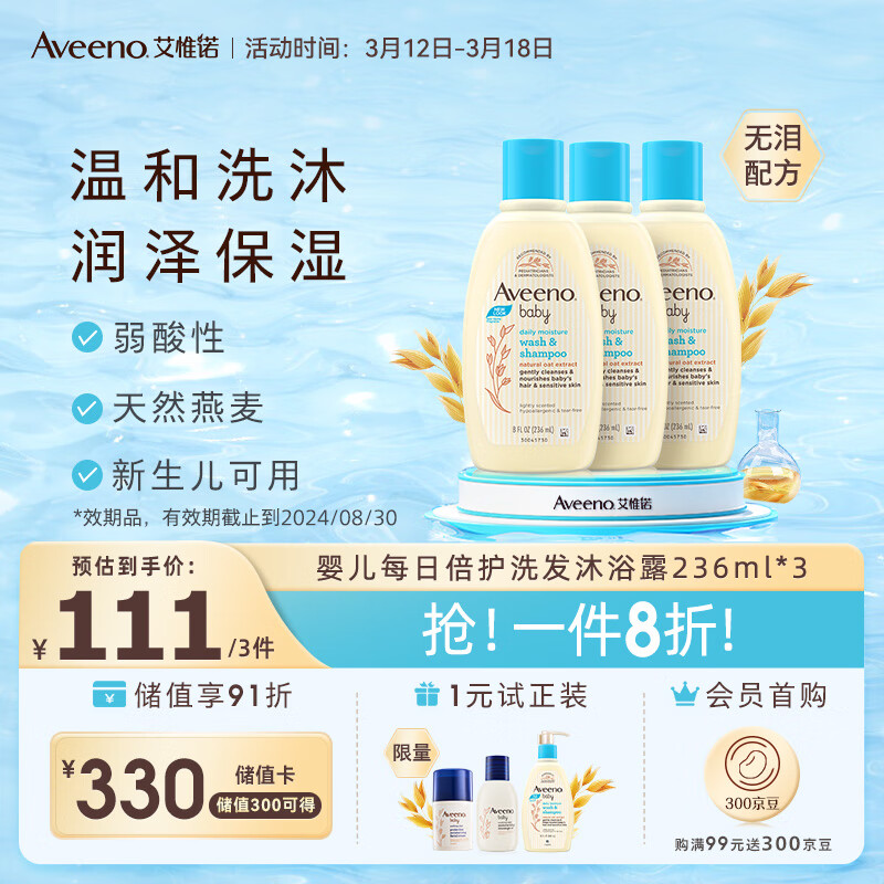 艾惟诺(Aveeno)儿童沐浴露洗发水二合一婴儿洗发水宝宝沐浴乳燕麦236ml*3价格:139.00元!