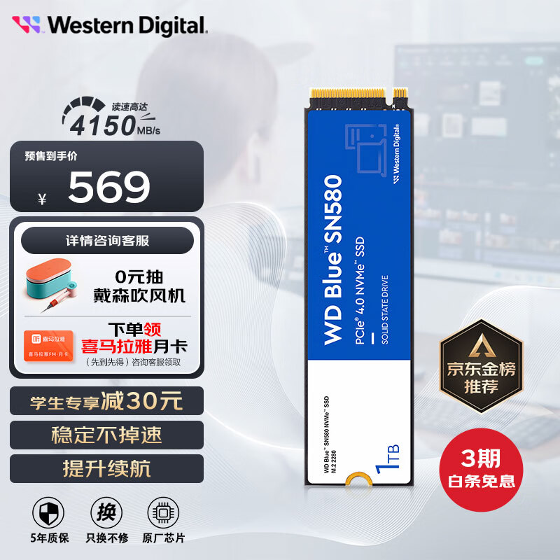 西部数据(WD)1TB SSD固态硬盘 M.2(NVMe协议)SN580 PCIe4.0 笔记本电脑台式机西数SN570升级储存硬盘价格:569.00元!