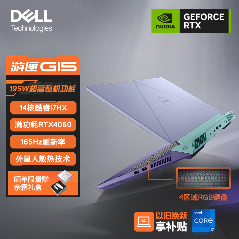 戴尔(DELL)游匣G15 游戏本笔记本电脑15.6英寸电竞本(14核酷睿i7HX 16G 1TB RTX4060 165Hz 外星人散热)紫价格:7799.00元!