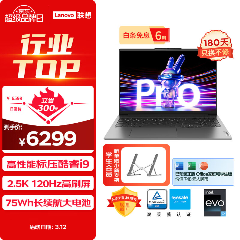 联想笔记本电脑小新Pro16超能本 高性能标压酷睿i9 16英寸轻薄本 32G 1T 2.5K高刷护眼屏 灰 游戏办公价格:6299.00元!