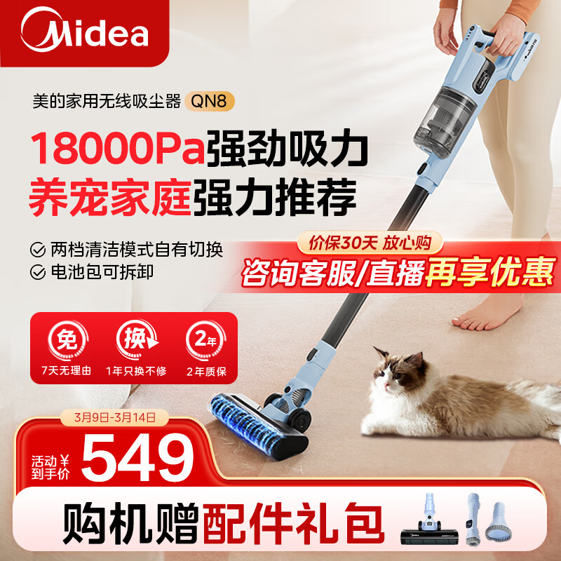 美的(Midea)吸尘器家用 QN8 无线手持吸尘器18KPa大吸力轻便无线车载两用吸尘器价格:549.00元!