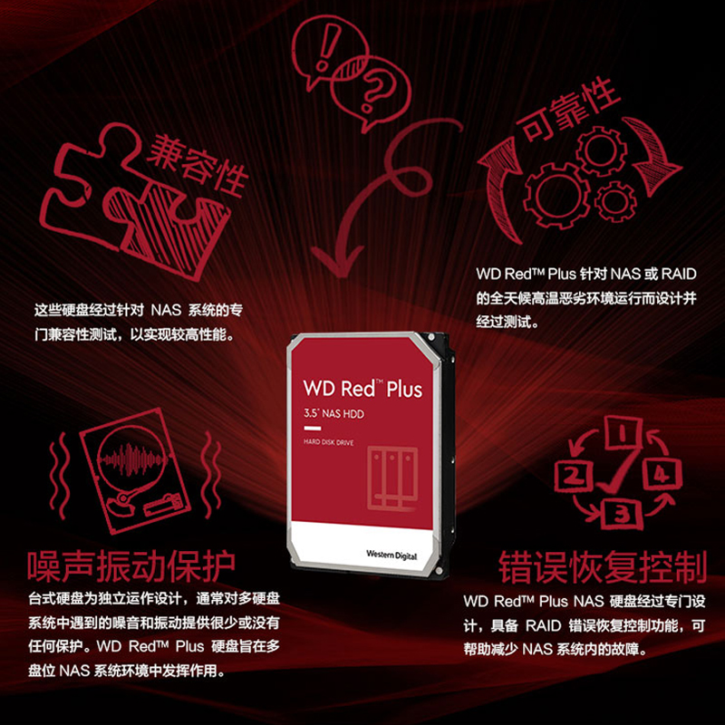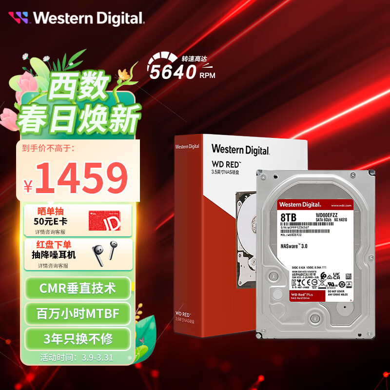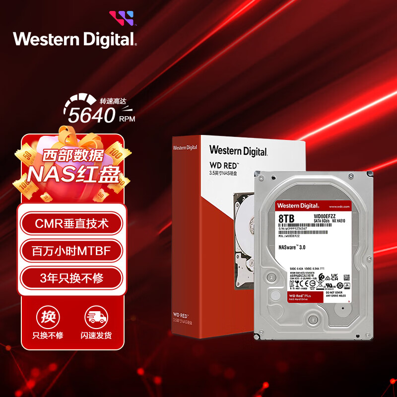 西部数据 NAS硬盘 WD Red Plus 西数红盘Plus 8TB 5640转 128MB SATA CMR (WD80EFZZ)价格:1459.00元!