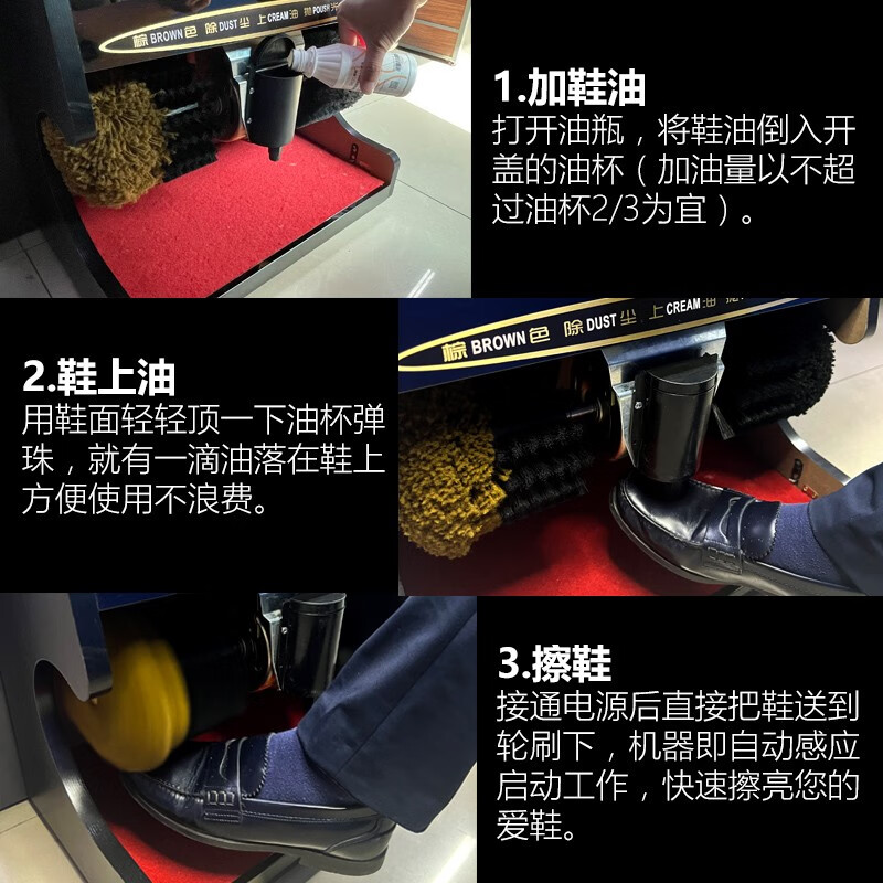 3、很高大上啊,再也不用弯腰或脱鞋费力的擦鞋子了。鞋油倒入也很方便,只要把脚往里一放,皮鞋轻轻松松出来就很亮了,出门就很靓丽了。