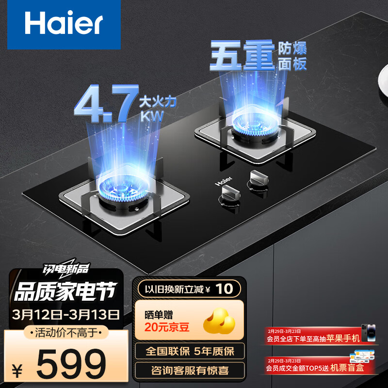 海尔(Haier)燃气灶天然气 嵌入式双灶具 4.7kw大火力 自动熄火保护 五重防护 台嵌两用一级能效Q2BE1(天)价格:699.00元!