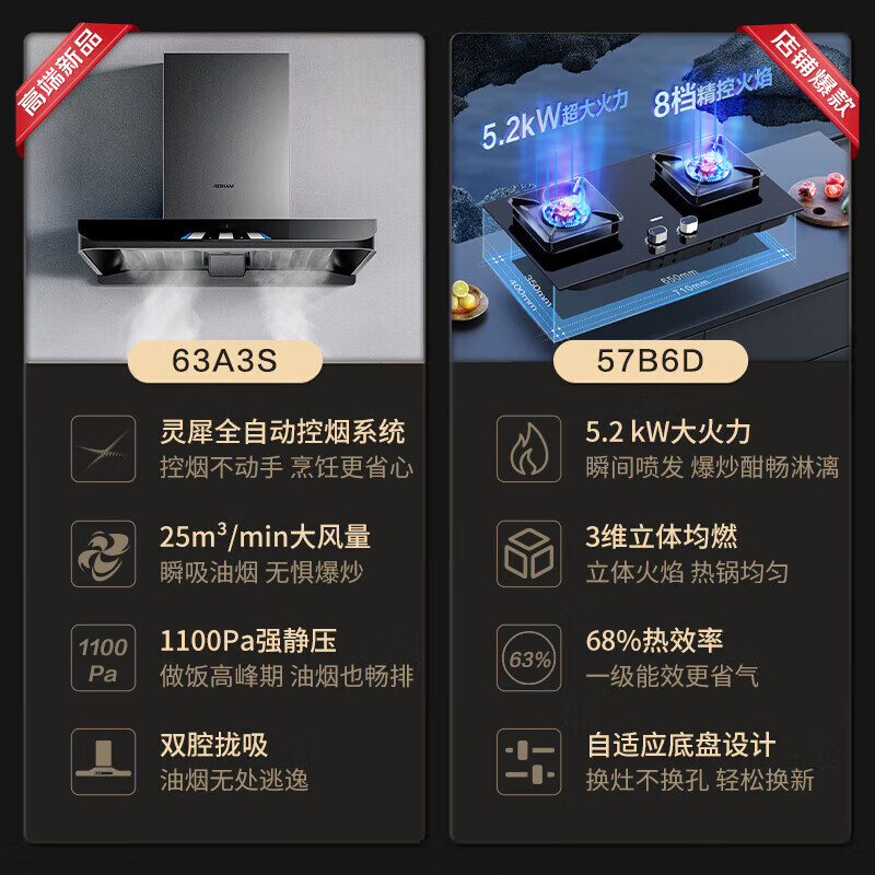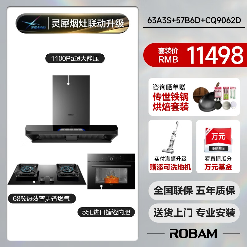 老板(Robam)灵犀全自动抽油烟机欧式顶吸双腔变频25风量家用吸油烟机套装蒸烤炖炸四合一63A3S+57B6D+CQ9062D价格:11498.00元!
