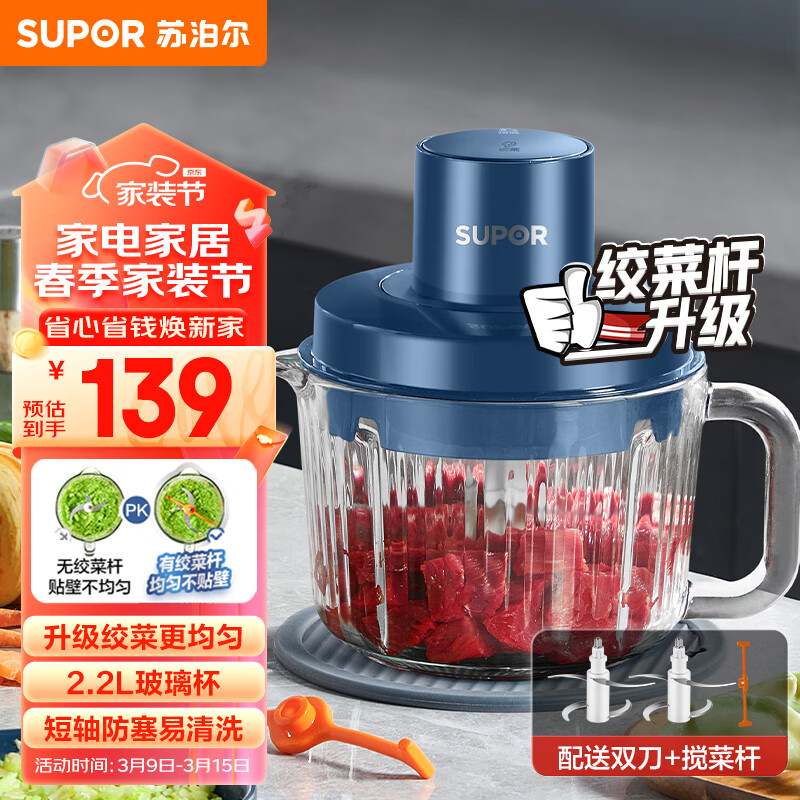 苏泊尔(SUPOR)绞肉机 双刀升级绞菜杆 家用多功能搅肉机2.2L电动绞肉馅切菜打肉碎肉机玻璃 JR55S-U价格:139.00元!
