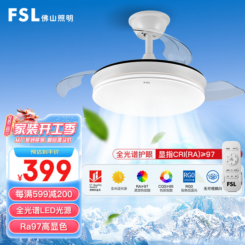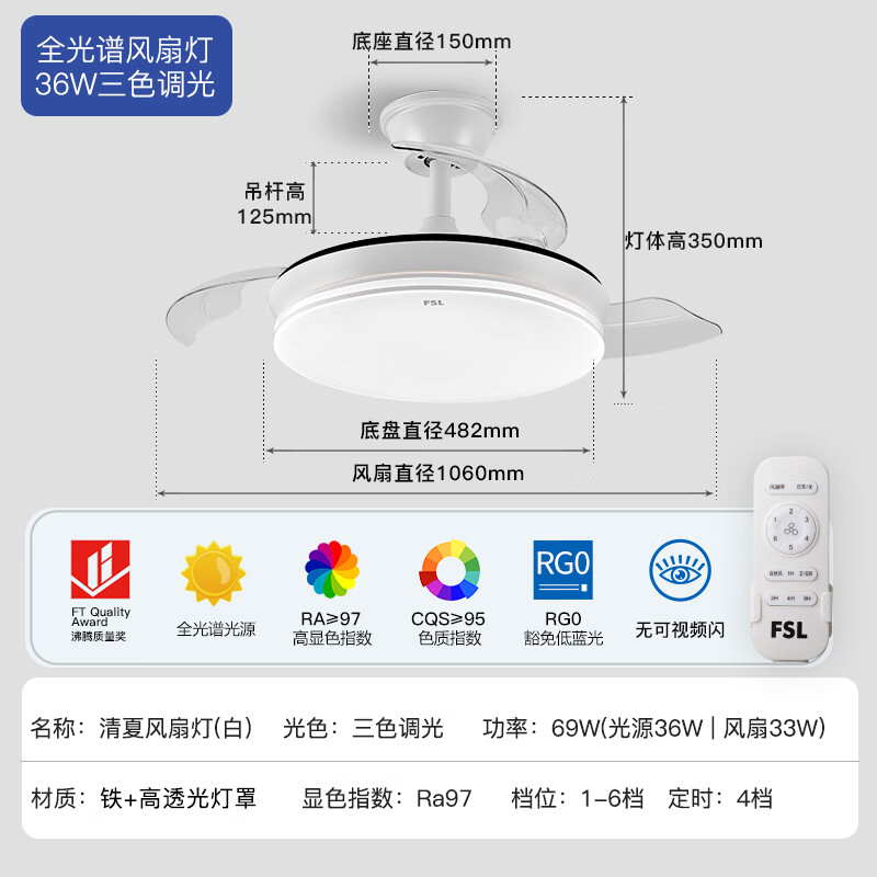 FSL佛山照明吊扇灯风扇灯餐厅客厅卧室led灯遥控调色灯饰灯具清夏白价格:599.00元!