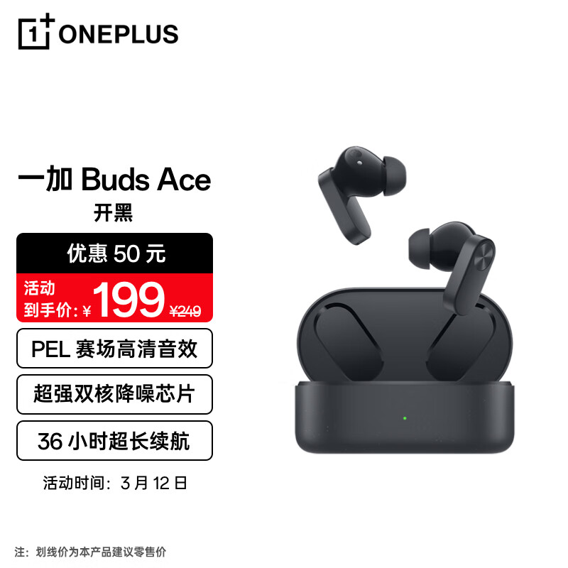 一加Buds Ace 真无线主动降噪蓝牙耳机 入耳式音乐运动电竞游戏耳机 通用oppo小米苹果华为手机 开黑价格:199.00元!