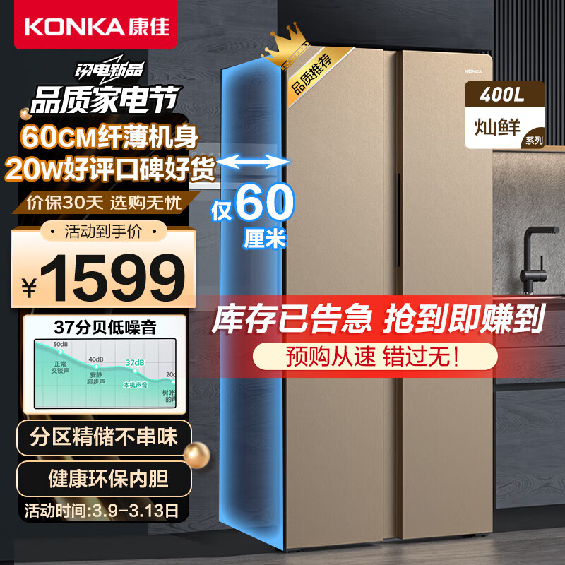 康佳400升60厘米超薄嵌入式对开双开门家用电冰箱智慧温控节能省电低噪音大容量分区精储BCD-400EGX5S价格:1477.00元!