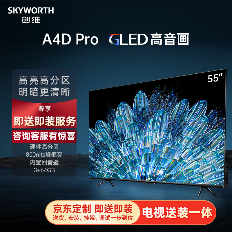 创维电视55A4D Pro【送装一体版本】55英寸电视机硬件高分区800nits3+64G智慧屏彩电液晶护眼游戏电视价格:2578.00元!