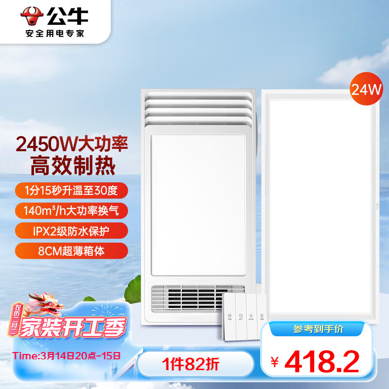 公牛(BULL)浴霸风暖浴室卫生间LED灯集成吊顶GY25AJZ浴霸+24W白色平板灯价格:510.00元!