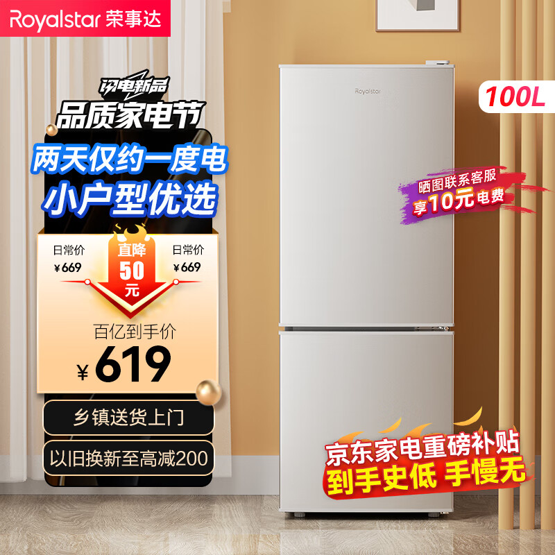 荣事达(Royalstar)100升迷你双开门小冰箱租房宿舍办公室小型家用双温冷冻冷藏节能环保省电低耗低音BCD-100ZY价格:619.00元!