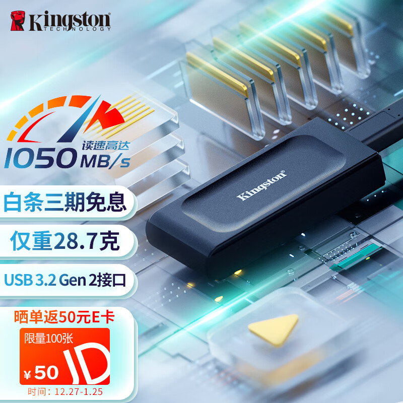 金士顿(Kingston)2TB USB3.2 Gen 2 移动固态硬盘(PSSD)XS1000 传输速度1050MB/s 手机直连 轻巧时尚价格:999.00元!