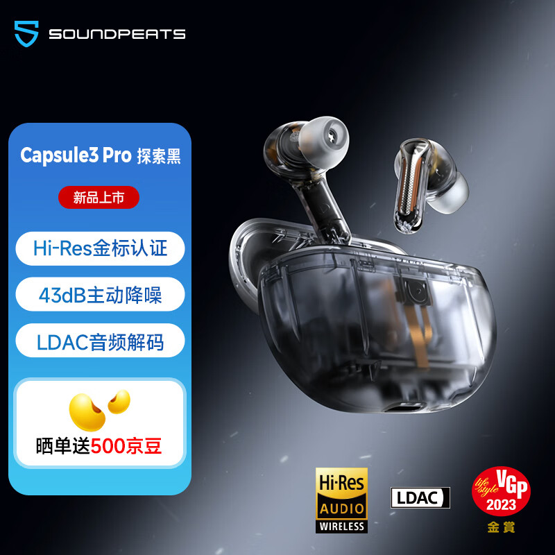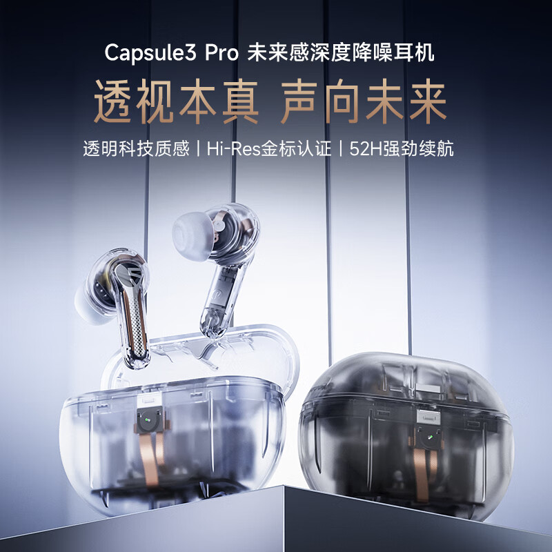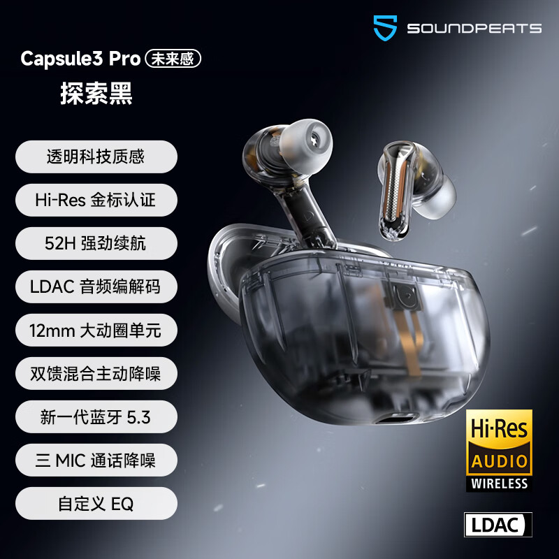 泥炭(SoundPEATS)Capsule3 Pro 未来感 真无线蓝牙耳机 Hi-Res 泥炭蓝牙耳机透明版入耳式主动降噪蓝牙5.3 探索黑价格:299.00元!