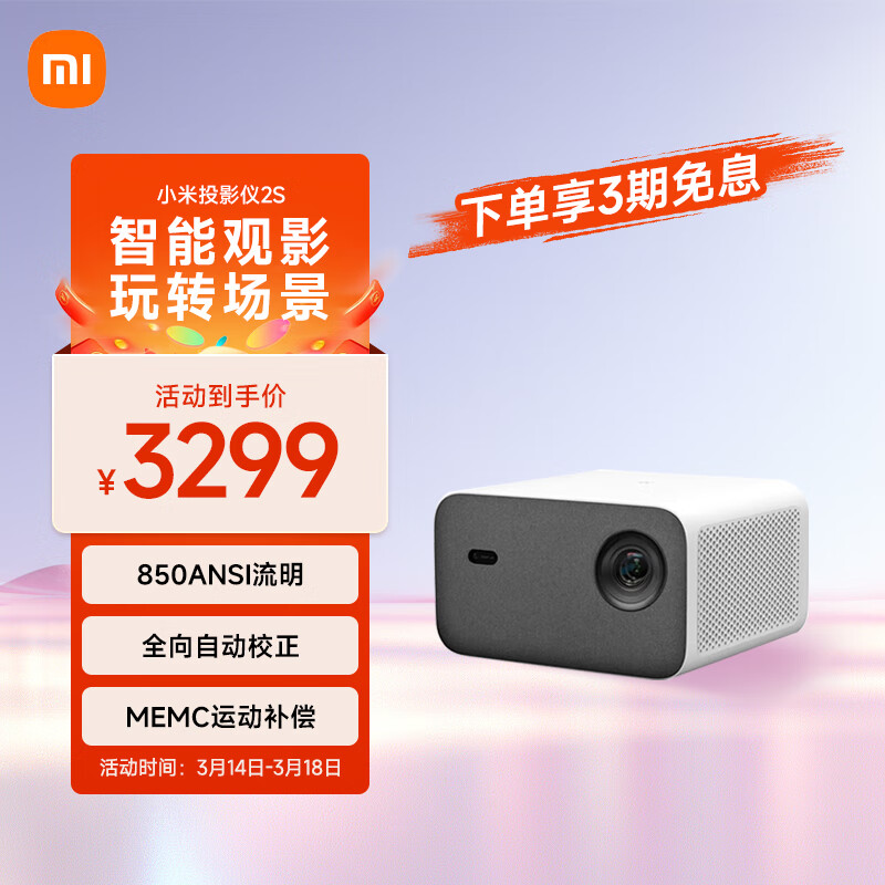 小米投影仪2S 投影仪家用 家庭影院 (MEMC运动补偿、全向自动校正、智能家居互联)价格:3299.00元!