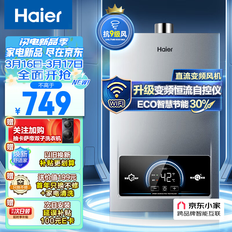 海尔(Haier)12升燃气热水器天然气水气双调变频恒温WIFI智控ECO节能五重净化多重安防家用JSQ22-12MODEL(12T)价格:699.00元!