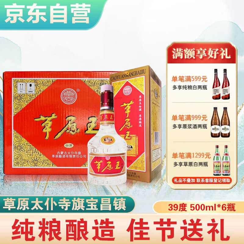 草原纯粮酿造 草原王黄草39度 清香型白酒 500ml*6瓶 整箱礼盒装价格:329.00元!