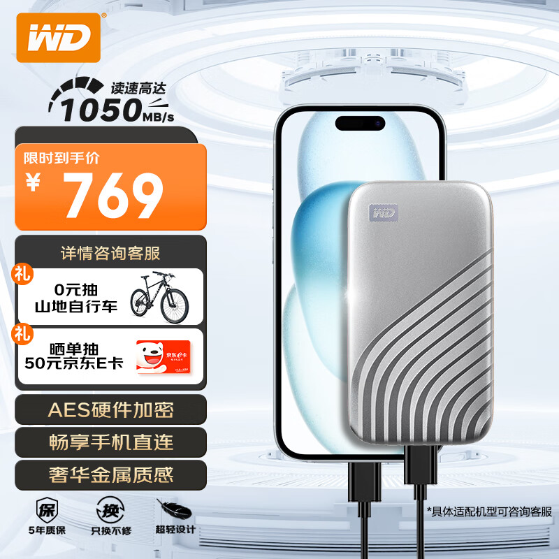 西部数据(WD)1TB NVMe 移动固态硬盘(PSSD)My Passport随行SSD type-c接口 1050MB/s 手机笔记本外置外接价格:769.00元!