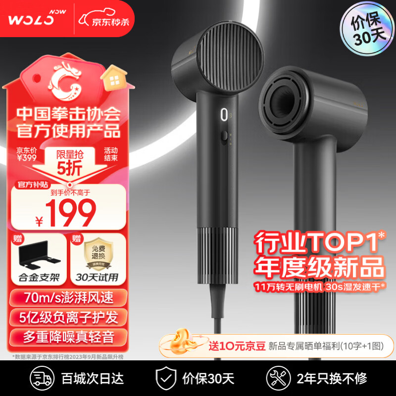 沃乐WOLO高速吹风机11万转大功率马达5亿负离子护发家用电风筒无叶大风力速干降噪礼物送女友 黑色价格:199.00元!