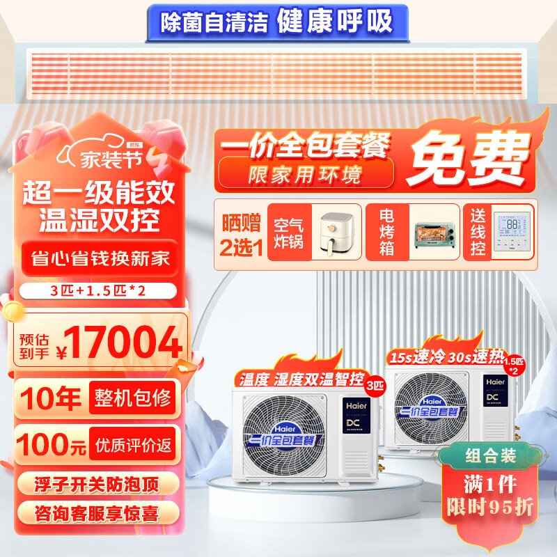 海尔(Haier)中央空调风管机一拖一 组合套餐3匹+1.5匹*2 新一级能效 云舒 全直流变频KFRd-72NW/72ECD81价格:17899.00元!