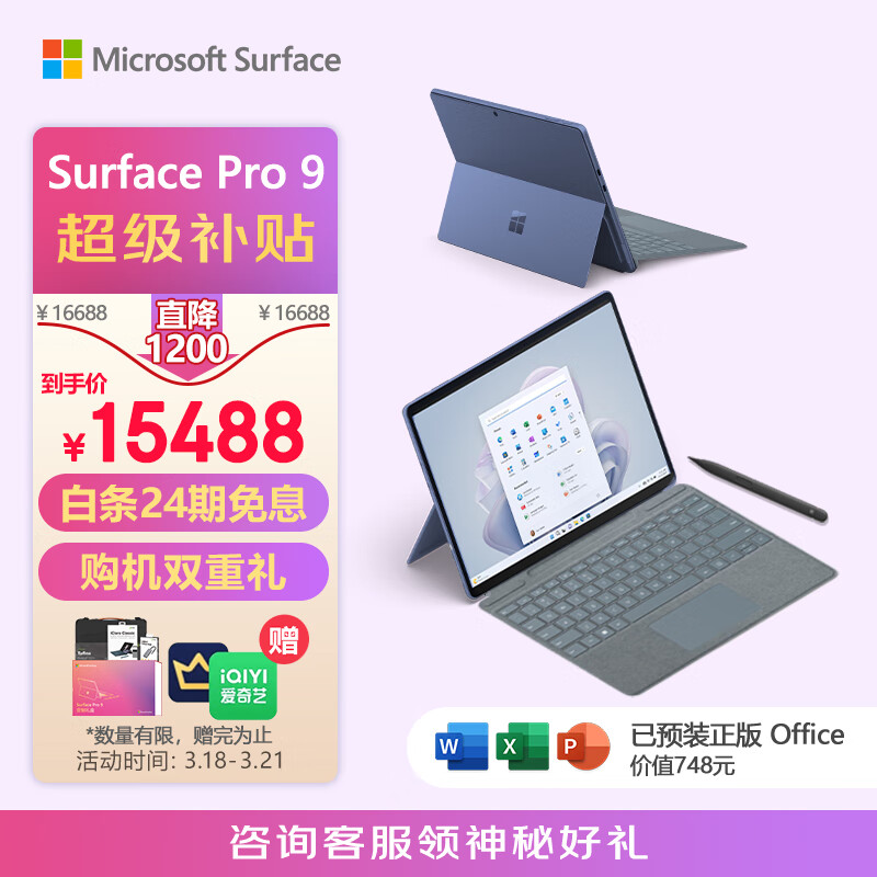 微软Surface Pro 9 宝石蓝+冰晶蓝带触控笔键盘盖i7 16G+512G 二合一平板电脑13英寸120Hz触控屏办公本价格:16688.00元!