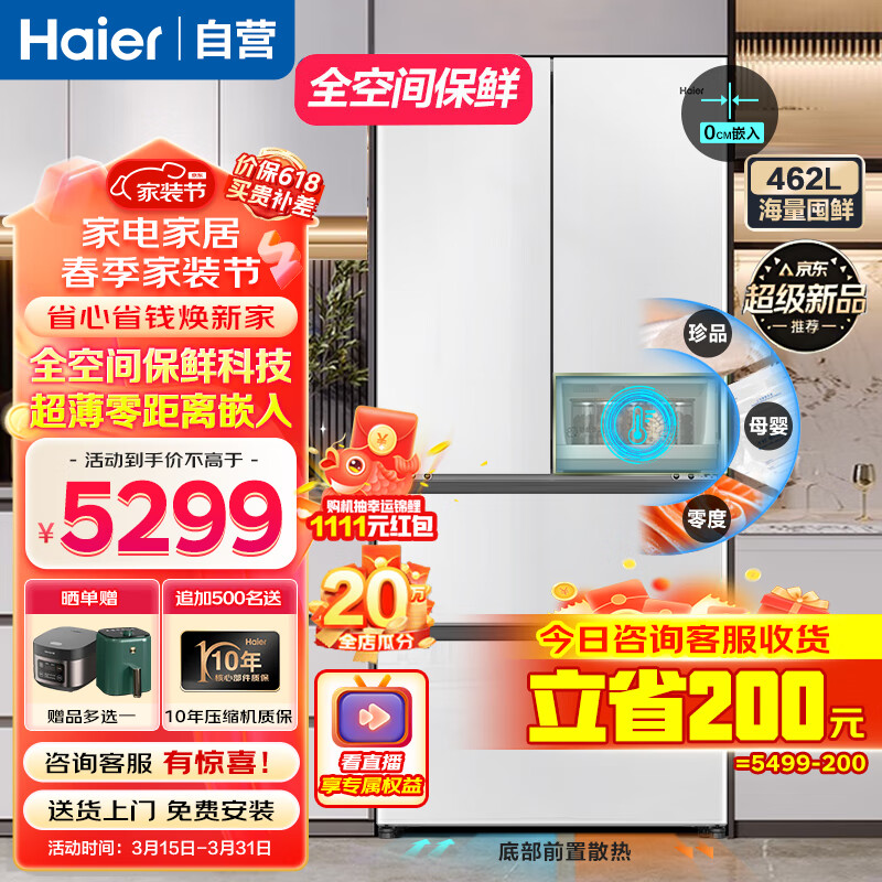 海尔白巧462L零距离自由嵌入多门四开门法式电冰箱家用白色一级能效超薄嵌入式底部散热 全空间保鲜价格:5499.00元!