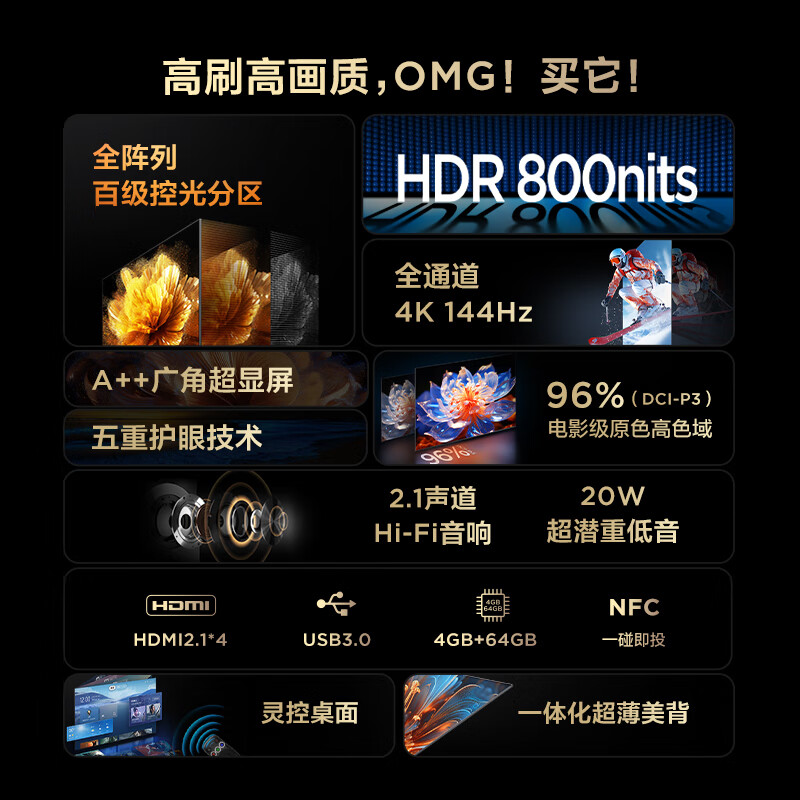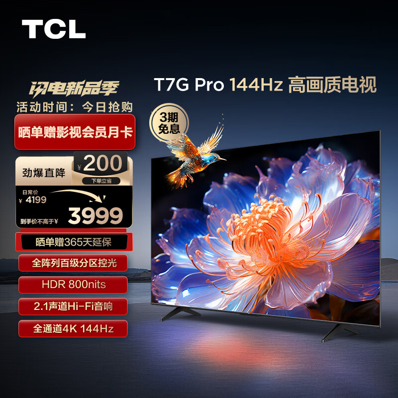 TCL电视 65T7G Pro 65英寸 百级分区 HDR800nits 4K 144Hz 2.1声道音响 高清液晶智能平板游戏电视机价格:3799.00元!
