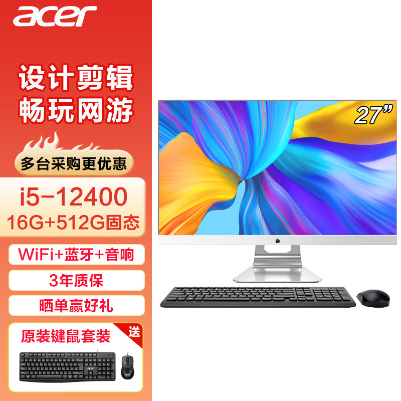 宏碁(acer)蜂鸟 一体台式机电脑 27英寸显示器(酷睿 12代 i5-12400 16G 512G SSD)不闪屏 办公 定制版价格:4149.00元!