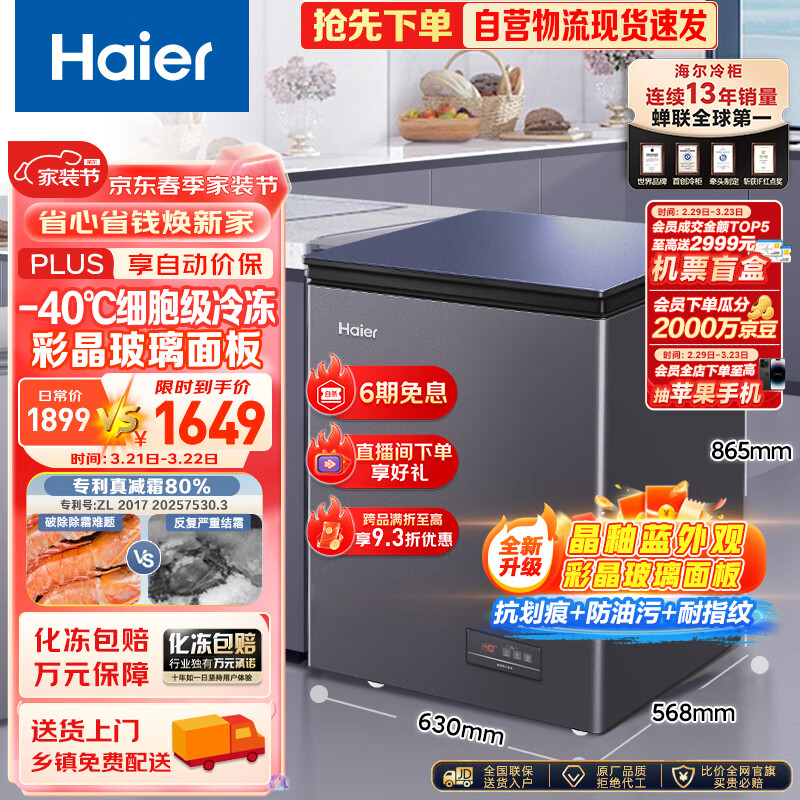 海尔(Haier)142升-40℃彩晶低霜小冰柜家用商用 冷藏柜冷冻柜冰柜小型小冰箱小型冷柜BC/BD-142GHEPGD以旧换新价格:1749.00元!