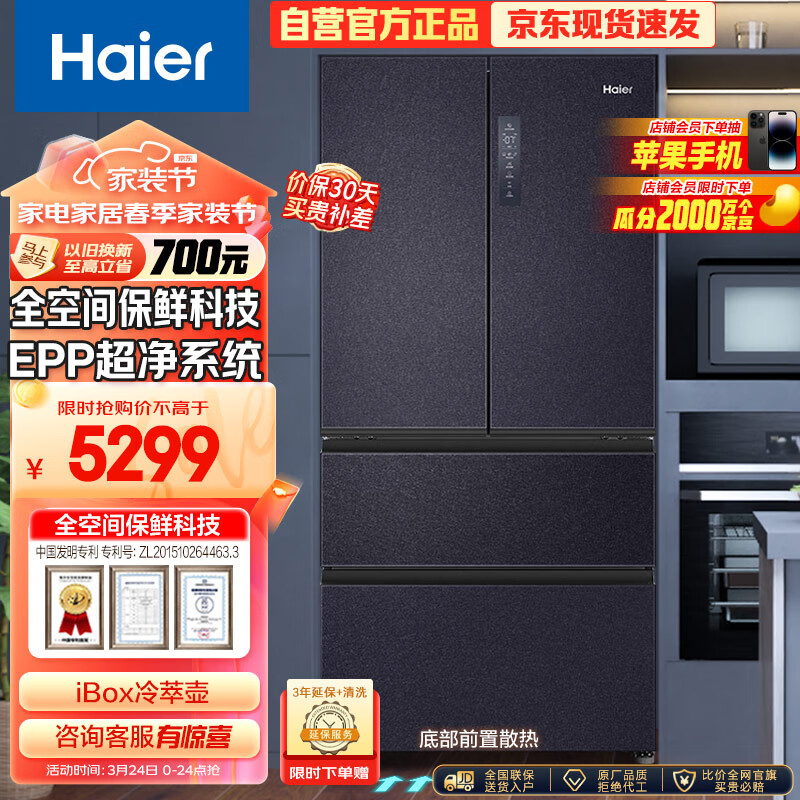 海尔(Haier)466升全空间保鲜科技法式多门四开门电冰箱家用无霜一级能效节能超薄嵌入式BCD-466WGHFD15B8U1价格:5299.00元!