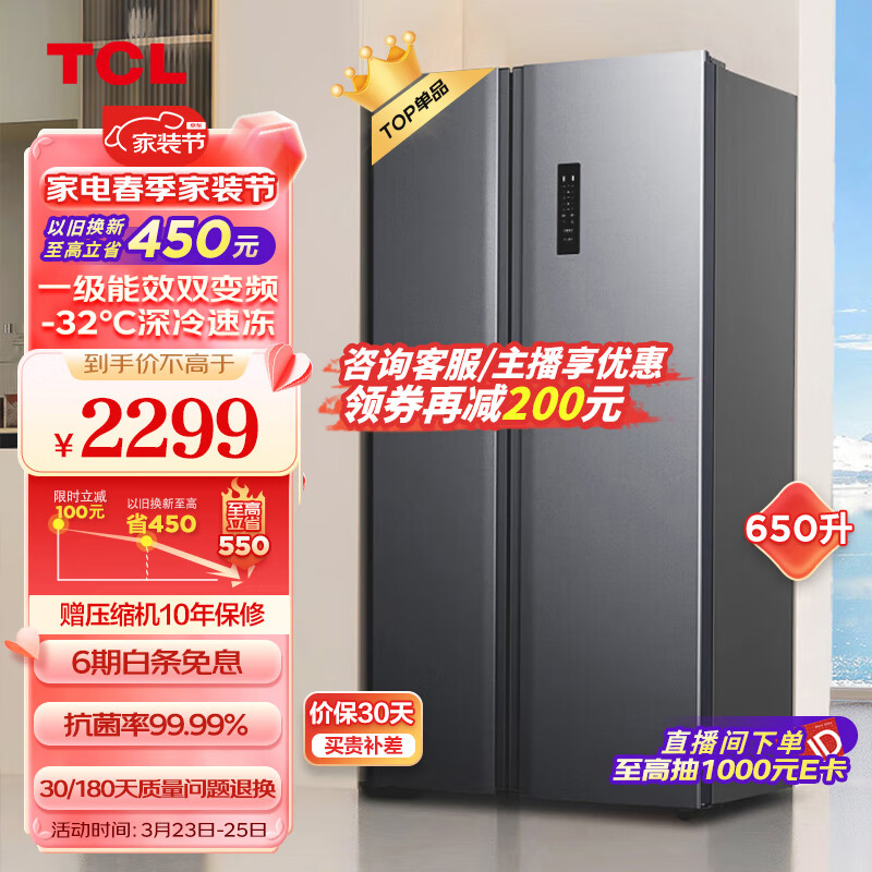 TCL 650升T3超大容量超薄冰箱对开双开门一级能效 双循环风冷无霜 一体双变频 34分贝 R650T3-S晶岩灰价格:2399.00元!